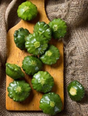 Odmiana wczesna o owocach w kształcie dysku; młode mają skórkę ciemnozieloną, starsze są prawie czarne.